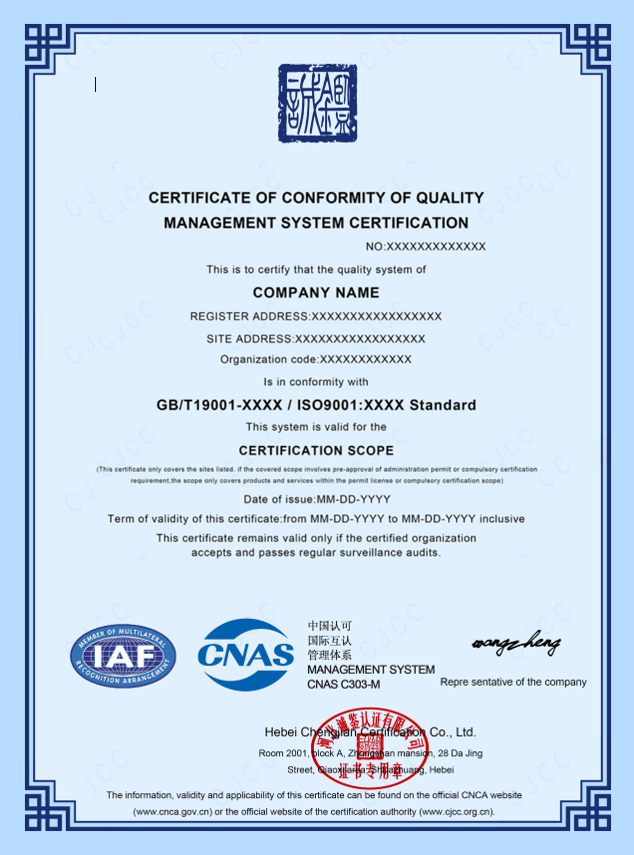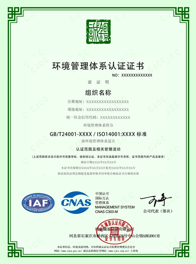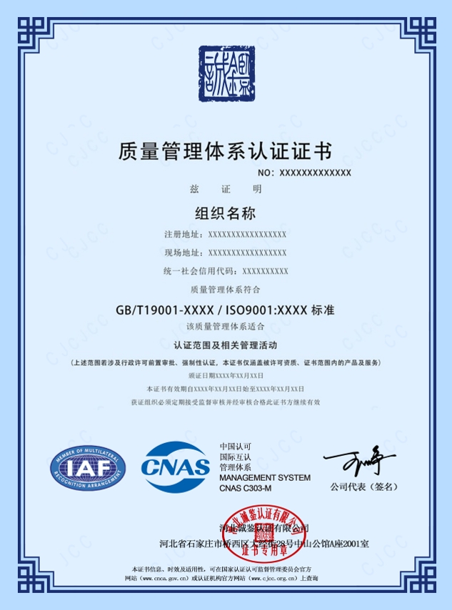 河北誠(chéng)鑒認(rèn)證有限公司(簡(jiǎn)稱(chēng)誠(chéng)鑒認(rèn)證/CJCC),創(chuàng)立于二零一七年,經(jīng)國(guó)家認(rèn)證認(rèn)可監(jiān)督管理委員會(huì)(CNAS)批準(zhǔn)(批準(zhǔn)號(hào)CNCA-R-2018-412),中國(guó)合格評(píng)定國(guó)家認(rèn)可委員會(huì)(CNAS)認(rèn)可(注冊(cè)號(hào):CNAS C303-M)),是從事質(zhì)量管理體系、環(huán)境管理體系、職業(yè)健康安全管理體系認(rèn)證,具有獨(dú)立法人資格的第三方認(rèn)證機(jī)構(gòu)。